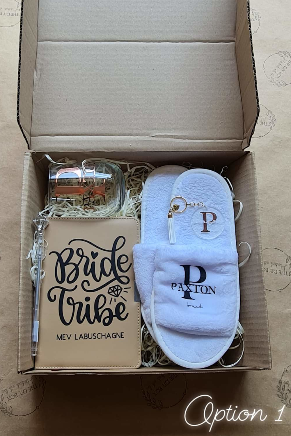 - Personalized Brown Gift Box with a name / design on the lid.